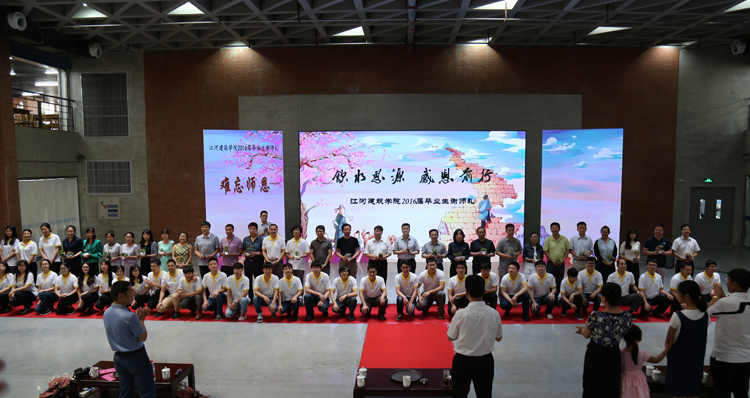 我院“饮水思源,感恩前行”2016届本科毕业生谢师礼于6月19日下午15:00在江河建筑楼B座梁思成纪念堂内举行。江河创建集团董事长刘载望校友,东北大学大连校友会秘书长王德虎校友,东北大学党委副书记杨明,外请教师代表夏永发、梁峰老师,学院党委书记安立鸿、院长修春亮、副院长刘抚英、副书记兼副院长徐长文、院长助理曲艺及全院教职工出席了谢师礼,出席活动的还有学院2016届全体本科毕业生及300余名低年级本科生。谢师礼由徐长文主持。