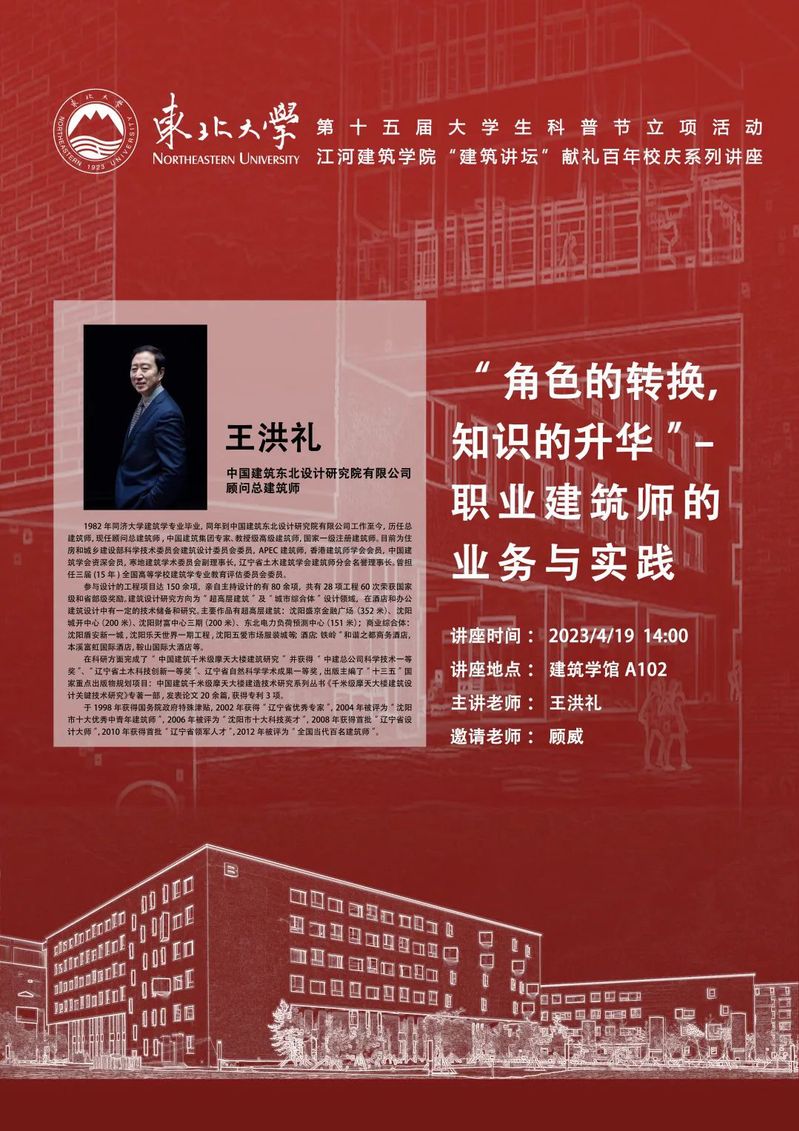 4月19日,应3377体育顾威老师邀请,中国建筑东北设计研究院有限公司顾问总建筑师王洪礼老师做客3377体育“建筑讲坛”(暨献礼百年校庆系列讲座),做题为《“角色的转换,知识的升华”——职业建筑师的业务与实践》的学术讲座,学院师生570余人参加线上线下的交流。