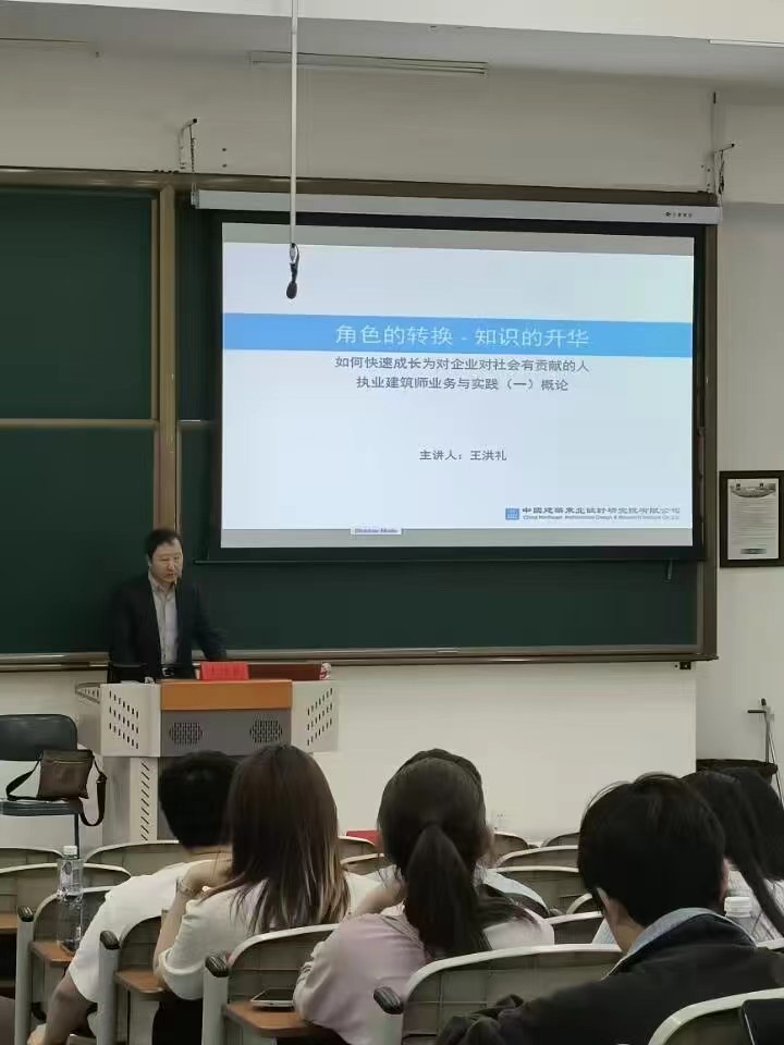 王洪礼以一个问题开始演讲——“如何迅速成长为对企业对社会有贡献的人”,概论过后,他从贴进学生的大学校园讲起,一步一步逐渐深入地过渡到企业职场。从大学校园到企业职场的环境转换,从同学到同事的称谓转换,从学士、硕士、博士到建筑师、高级建筑师、教授级高级建筑师的职称转换,从学习、吸纳、知识积累到贡献、付出、价值创造的状态转换,从专业技能到技能实践的心态转换等,深刻讲解了学生角色的转换经历。
