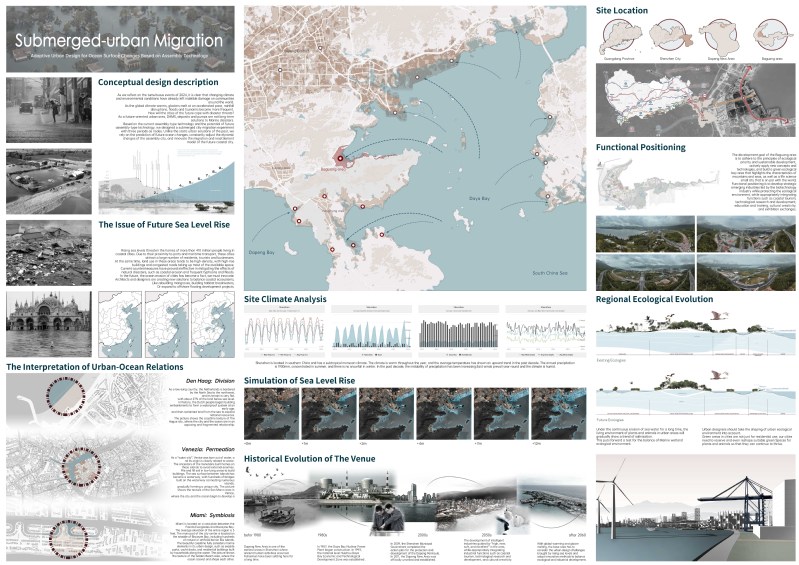 当我们反思 2024 年发生的动荡事件时,我们可以清楚地看到,不断变化的气候环境条件所带来的挑战早已经给世界各地的社区留下了不可磨灭的损害。这种变化不是一蹴而就的,而是在长期积累中逐渐显现出来的。随着全球气候变暖,海平面的上升,未来的滨海都市怎么才能应对海平面上升的威胁?我们聚焦于深圳市大亚湾区大鹏新区,作为面向未来的城市区域,堤坝、沉积和水泵都不是应对海洋灾害的长期解决方案。在未来 100 年里,这些动态且持续的海平面上升状态将比其他任何事情都更加彻底地改变城市环境。我们基于当下的装配式技术以及未来装配技术的潜力,制定了一个淹没城市迁移试验,以三个时期为节点,思考未来滨海都市的迁移与安置模式。我们提出洋面变动适应性概念城市设计,与过去的静态城市解决方案不同。通过依靠未来海洋变化预测,不断调整装配城市的动态变化,最终创新出一个适应未来海洋变化趋势的滨海城市。