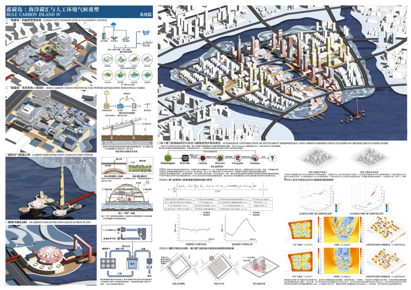 本设计位于大连金普新区小窑湾科创园区,是一座约为1平方公里的岛屿。大连作为气候适应性试点,因此本设计提出蓝碳岛的概念,选择一座城市岛屿作为海洋碳汇与人工环境气候重塑的试验区。通过模拟微气候,选定最优城市形态,并利用羊毛算法规划蓝绿与开放空间。实施碳捕集与封存策略,发掘可再生能源。设计气候碳监测塔,将收集液压后的碳通过演示塔注入海底,与海水催化形成固体永久封存。此外,配备了海水制氢系统和检测系统,实现零碳供能。针对城市片区形态,在遗传算法的支持下,以碳排放量最低为目标进行寻优。以居住区为例,在相同容积率下,通过设置基准点和迭代规则推算禁选区域,并生成建筑体块。通过后续环境模拟选择最优的住区形态。