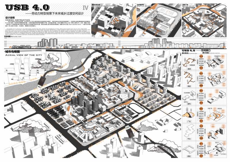 本设计场地位于城乡结合区域,面临着未来乡村人口向城市流动和劳动力转型的时代背景。考虑到劳务市场的变迁以及乡村回迁场地的现状,预计未来将有大量仅掌握原始劳动技能的乡村人口涌入城市。这部分人群在生存上将面临多重挑战:缺乏工作机会、难以适应城市的生活习惯,以及因离开故土而产生的深切思乡之情。这些问题进而可能导致城市凝聚力下降、治安状况恶化等社会问题。本设计特别关注这一特殊外来人群的工作、生活和情感需求,旨在通过设计三方面的城乡接口——工作接口、生活接口和情感接口,帮助他们实现从乡村到城市的生存过渡。同时,通过空间接口的设计,助力城市的协调发展,促进城乡之间的和谐融合。标题中的USB4.0象征着‘Urban Suburban Bond’——即城市与乡村的连接,它涵盖了上述的工作接口、生活接口、情感接口和空间接口,寓意着本设计致力于构建USB接口,连接城乡,促进两者的共同发展与繁荣。”