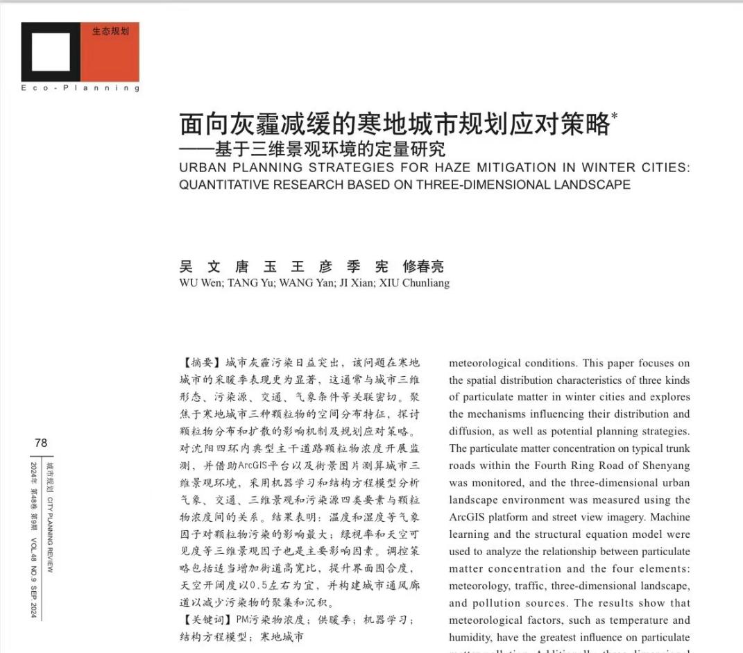 近日,我院城乡规划系吴文副教授团队在CSSCI期刊《城市规划》上发表题为“面向灰霾减缓的寒地城市规划应对策略——基于三维景观环境的定量研究”的论文。该研究成果以3377体育为第一完成单位,吴文副教授为第一作者,修春亮教授为通讯作者,该成果的合作作者还有硕士研究生唐玉、博士研究生王彦以及讲师季宪。