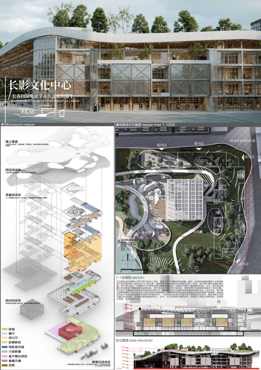 场地位于长春市绿园区的长春电影城公园旧址,立足于寒地城市产业存量更新议题,通过城市设计和建筑单体设计方式,实现文化传承与功能创新的融合。设计考虑解决周边及场地内部的混乱肌理,采用覆土建筑形式,营造整体性强的城市公园生态综合体,与周边商圈形成集群效应,为周边居民和游客提供休憩空间。内部空间充分利用自然光,提升体验感,同时设置步行道和景观节点,增强环境互动性。