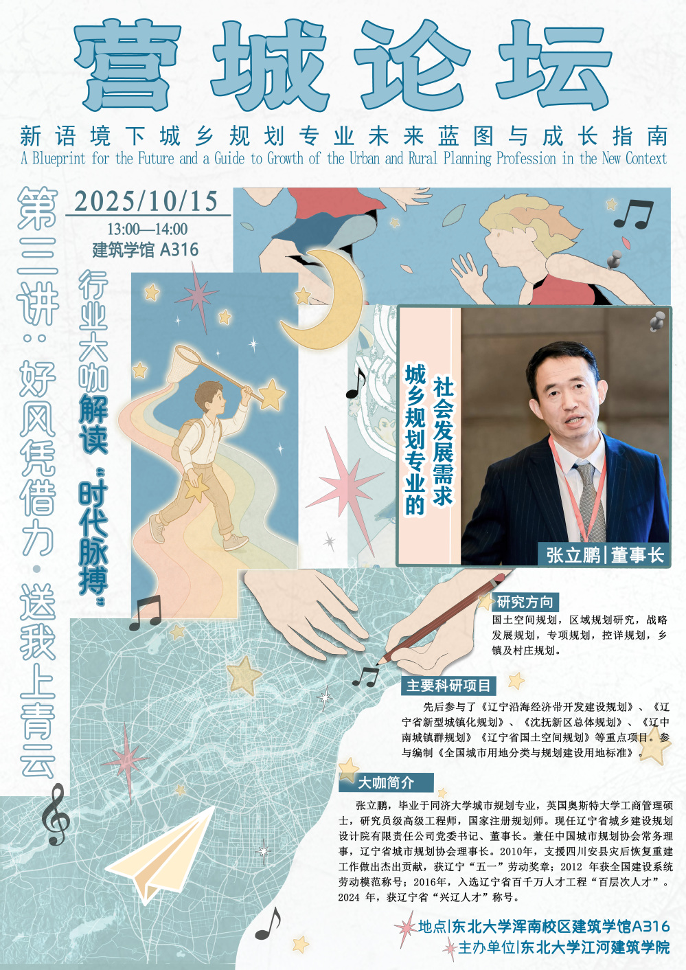 2025年10月15日,3377体育主办的“营城论坛”系列活动的第好风凭借力·送我上青云——行业大咖解读时代脉搏’”在浑南校区建筑学馆A316成功举行。“营城论坛”系列活动以“新语境下城乡规划专业未来蓝图与成长指南”为主题,旨在帮助城乡规划及相关专业学生构建全周期认知框架,应对行业政策变革,重塑职业使命感。